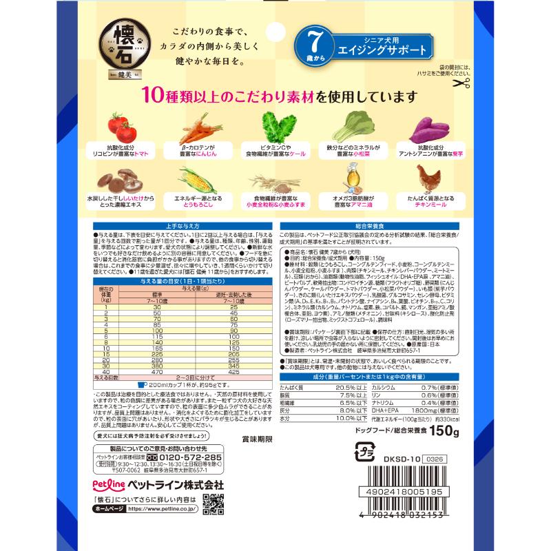 | 素材 | <原材料> 穀類(とうもろこし、コーングルテンフィード、小麦粉、コーングルテンミール、小麦全粒粉、小麦ふすま)、肉類(チキンミール、チキンレバーパウダー、ミートミール)、豆類(おから)、油脂類(動物性油脂、フィッシュオイル:DHA・EPA源 、アマニ油)、ビートパルプ、軟骨抽出物:コンドロイチン源、糖類(フラクトオリゴ糖)、野菜類(にんじんパウダー、ケールパウダー、トマトパウダー、小松菜パウダー)、いも類(紫芋パウダー)、きのこ類(しいたけエキスパウダー)、乳酸菌、グルコサミン、セレン酵母、ビタミン類(A、D3、E、K3、B1、B2、パントテン酸、ナイアシン、B6、葉酸、ビオチン、B12、C、コリン)、ミネラル類(カルシウム、ナトリウム、塩素、鉄、コバルト、銅、マンガン、亜鉛アミノ酸複合体、亜鉛、ヨウ素)、アミノ酸類(メチオニン)、甘味料(キシロース)、酸化防止剤(ローズマリー抽出物、ミックストコフェロール)、調味料 <保証成分> たんぱく質20.5%以上、脂質7.5%以上、粗繊維6.5%以下、灰分8.0%以下、水分10.0%以下、カルシウム0.7%(標準値)、リン0.6%(標準値)、ナトリウム0.4%(標準値)、DHA+EPA1800mg(標準値) <エネルギー> 約330kcal/100g |