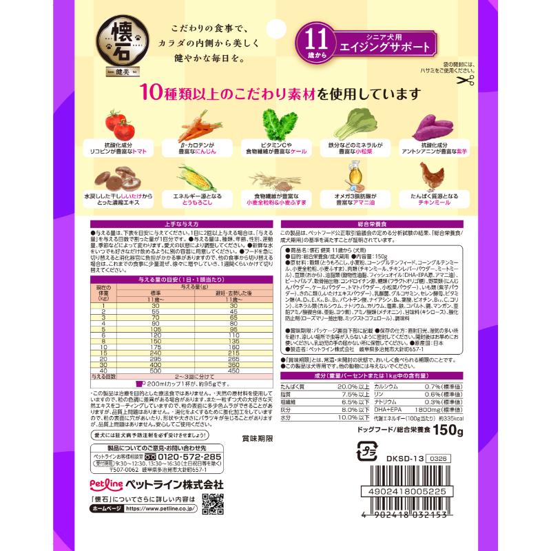 | 素材 | <原材料> 穀類(とうもろこし、小麦粉、コーングルテンフィード、コーングルテンミール、小麦全粒粉、小麦ふすま)、肉類(チキンミール、チキンレバーパウダー、ミートミール)、豆類(おから)、油脂類(動物性油脂、フィッシュオイル:DHA・EPA源、アマニ油)、ビートパルプ、軟骨抽出物:コンドロイチン源、糖類(フラクトオリゴ糖)、野菜類(にんじんパウダー、ケールパウダー、トマトパウダー、小松菜パウダー)、いも類(紫芋パウダー)、きのこ類(しいたけエキスパウダー)、乳酸菌、グルコサミン、セレン酵母、ビタミン類(A、D3、E、K3、B1、B2、パントテン酸、ナイアシン、B6、葉酸、ビオチン、B12、C、コリン)、ミネラル類(カルシウム、ナトリウム、カリウム、塩素、鉄、コバルト、銅、マンガン、亜鉛アミノ酸複合体、亜鉛、ヨウ素)、アミノ酸類(メチオニン)、甘味料(キシロース)、酸化防止剤(ローズマリー抽出物、ミックストコフェロール)、調味料 <保証成分> たんぱく質20.0%以上、脂質7.5%以上、粗繊維6.5%以下、灰分8.0%以下、水分10.0%以下、カルシウム0.7%(標準値)、リン0.6%(標準値)、ナトリウム0.3%(標準値)、DHA+EPA1800mg(標準値) <エネルギー> 約335kcal/100g |