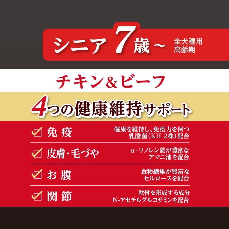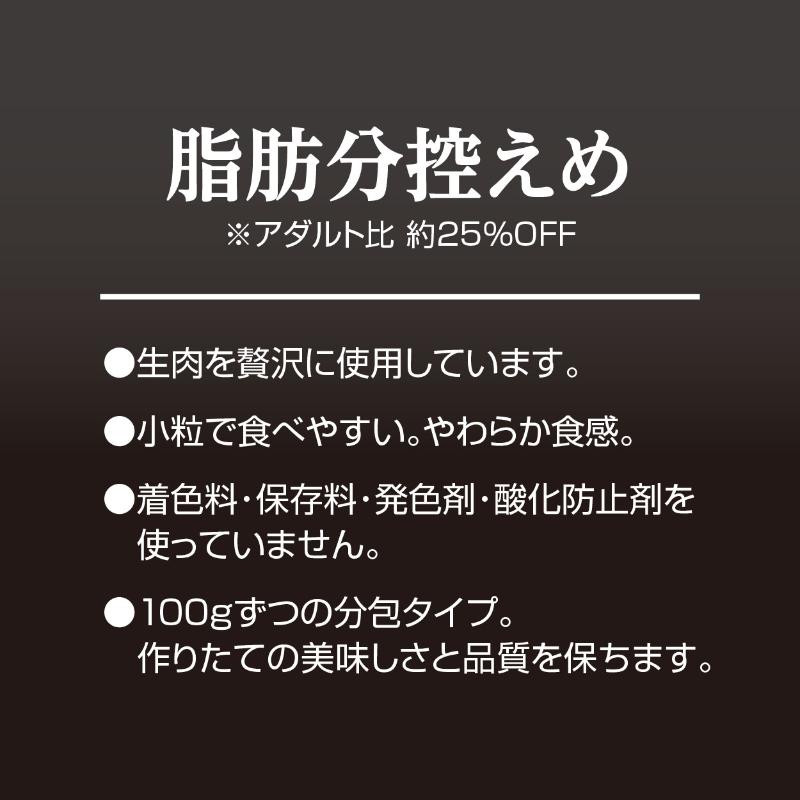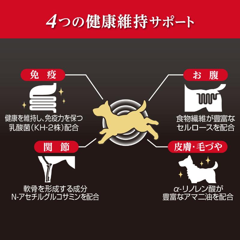 | 素材 | <原材料> 肉類(鶏・牛・鶏レバー)、脱脂大豆、コラーゲン、糖類、植物性油脂、デキストリン、N-アセチルグルコサミン、アマニ油、酵母、乳酸菌(KH-2株(熱処理済))、加工でんぷん、グリセリン、ソルビトール、ミネラル類(カルシウム・リン・塩素・ナトリウム・鉄・亜鉛・銅・ヨウ素・コバルト)、メチオニン、pH調整剤、セルロース、ポリリン酸Na、ビタミン類(A・B1・B2・B12・D・E・コリン・パントテン酸) <保証成分> たん白質24.0%以上、脂質8.5%以上、粗繊維1.0%以下、灰分7.0%以下、水分27.0%以下、ナトリウム:0.6g以下、カルシウム:0.37%以上、リン:0.3%以上、ビタミンA:3,650IU以上、ビタミンB1:1.65mg以上、ビタミンD:365IU以上、リノール酸:0.81%以上 <エネルギー> 342kcal/100g |