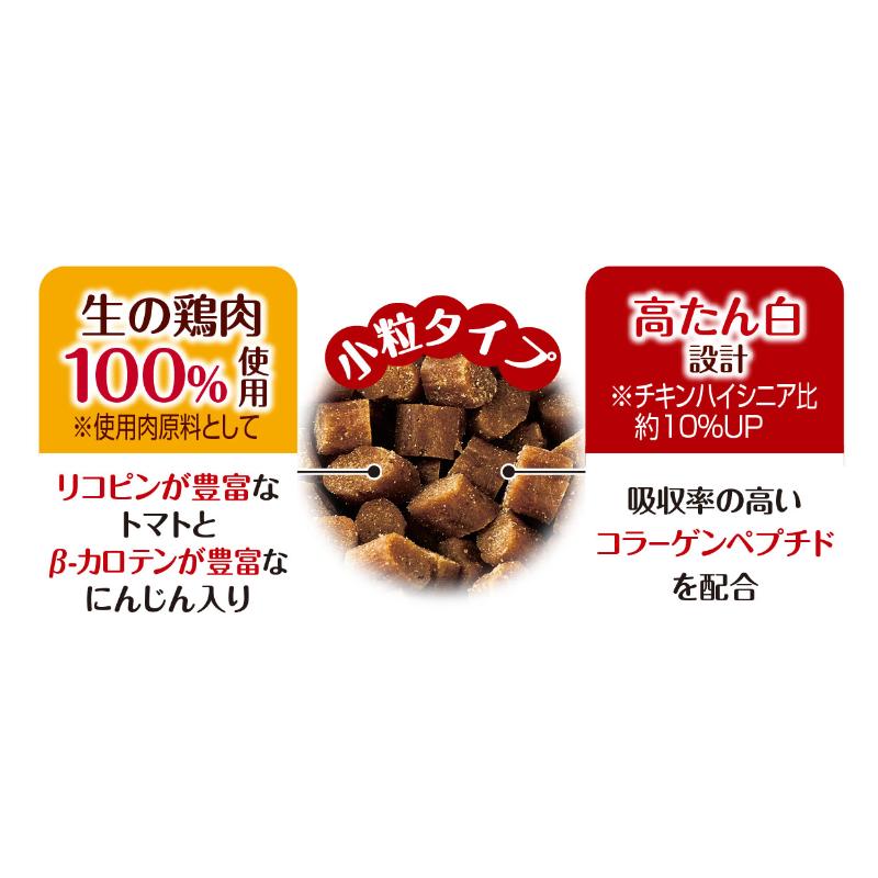 | 素材 | <原材料> 肉類(鶏・鶏ササミ・鶏レバー)、小麦粉、脱脂大豆、植物性油脂、糖類、小麦たん白、コラーゲンペプチド、小麦ブラン、酵母エキス、オリゴ糖、野菜類(トマト・にんじん)、アマニ油、酵母、乳酸菌(ラクリス)、サメ軟骨抽出物(コンドロイチン含有)、加工でんぷん、グリセリン、プロピレングリコール、ソルビトール、ミネラル類(カルシウム・塩素・カリウム・鉄・亜鉛・リン・ケイ素・銅・ヨウ素・マンガン・コバルト)、膨張剤、リン酸塩(Na)、ビタミン類(A・B2・B12・D・E・コリン)、グルコサミン、メチオニン <保証成分> たん白質19.0%以上、脂質6.0%以上、粗繊維2.0%以下、灰分6.0%以下、水分30.0%以下、ナトリウム:0.5g以下、カルシウム:0.35%以上、リン:0.28%以上、ビタミンA:3,500IU以上、ビタミンB1:1.58mg以上、ビタミンD:350IU以上、リノール酸:0.77%以上 <エネルギー> 326kcal/100g |