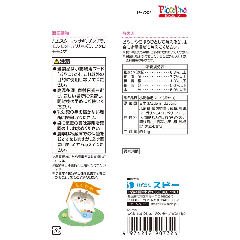 | 注意事項 | ・当製品は小動物フード(おやつ)です。これ以外の目的に使用しないでください。