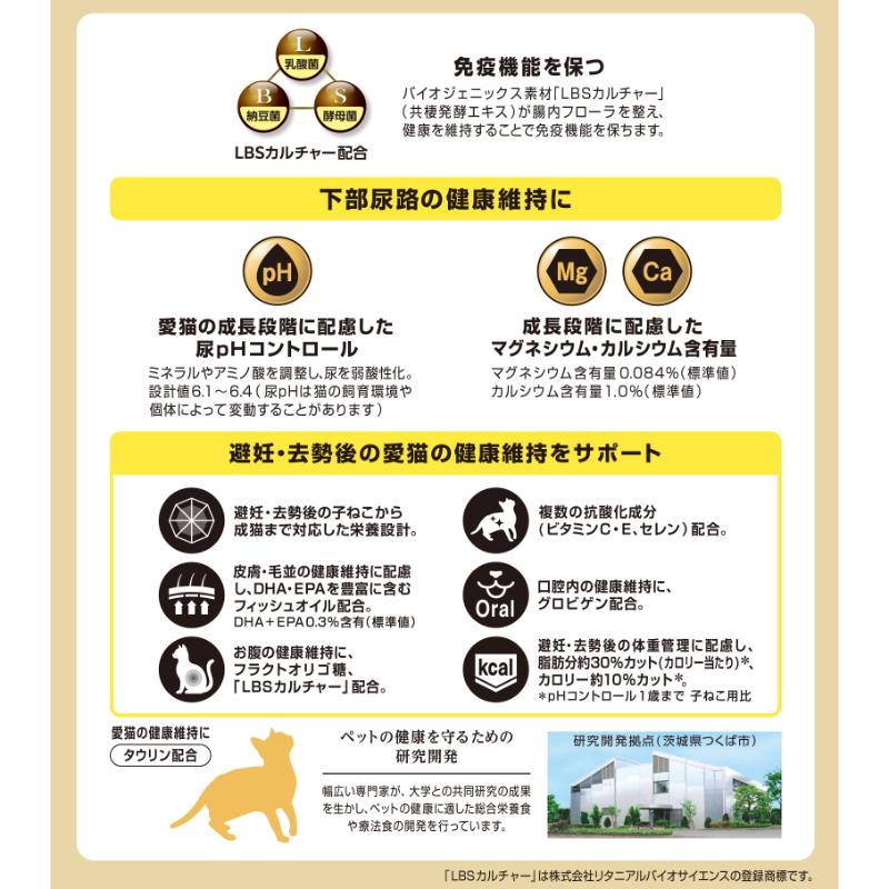 ・避妊・去勢後の適正体重維持に配慮し、脂肪分(子ねこ用比約30%)、カロリー(子ねこ用比約10%)をカットしました。