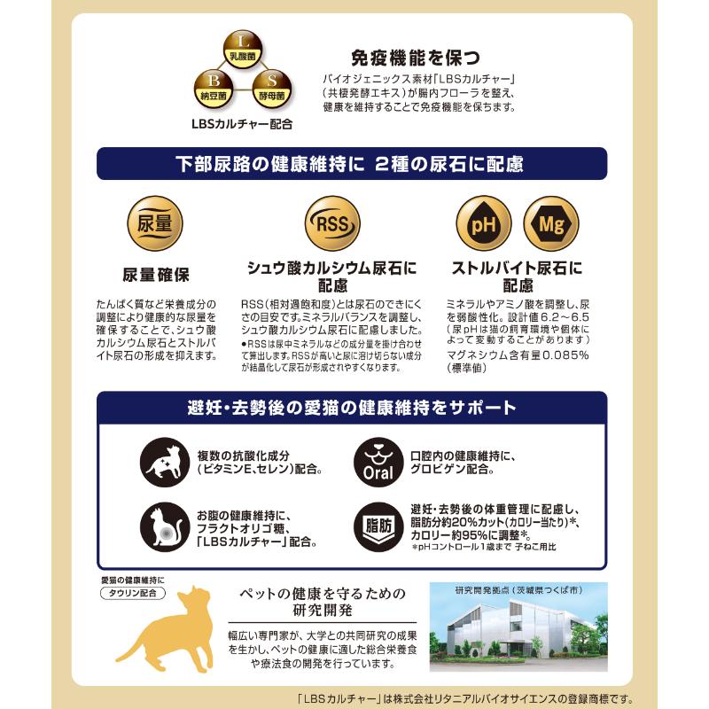 ・シュウ酸カルシウム尿石に配慮してRSS(相対化飽和度)を低く設計、ストルバイト尿石に配慮しミネラルやアミノ酸を調整し、尿を弱酸性化(設計値6.2-6.5)、マグネシウム含有量0.085%(標準値)に設計。