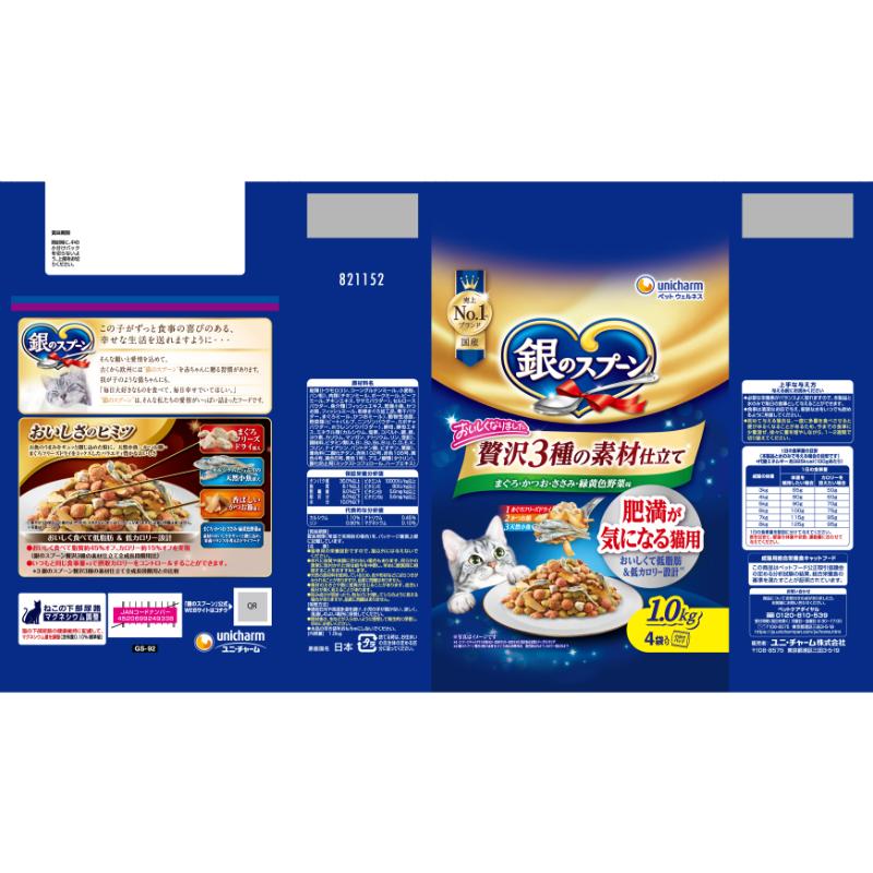 [ユニ・チャーム]銀のスプーン 贅沢3種の素材仕立て まぐろ・かつお・ささみ・野菜味 肥満が気になる猫用 1.0kg