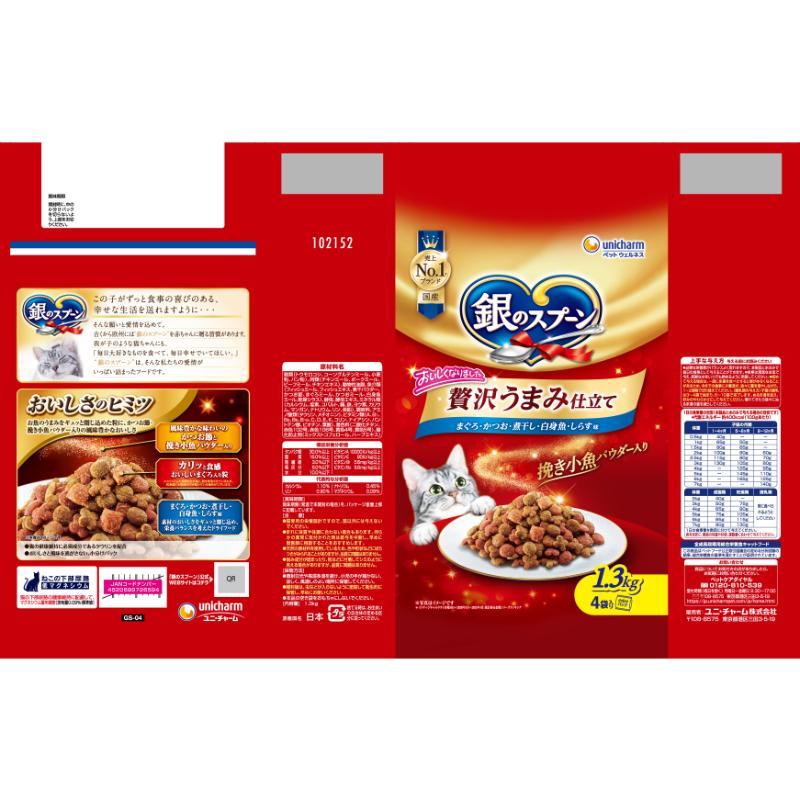 [ユニ・チャーム]銀のスプーン 贅沢うまみ仕立て まぐろ・かつお・煮干し・白身魚・しらす味 1.3kg