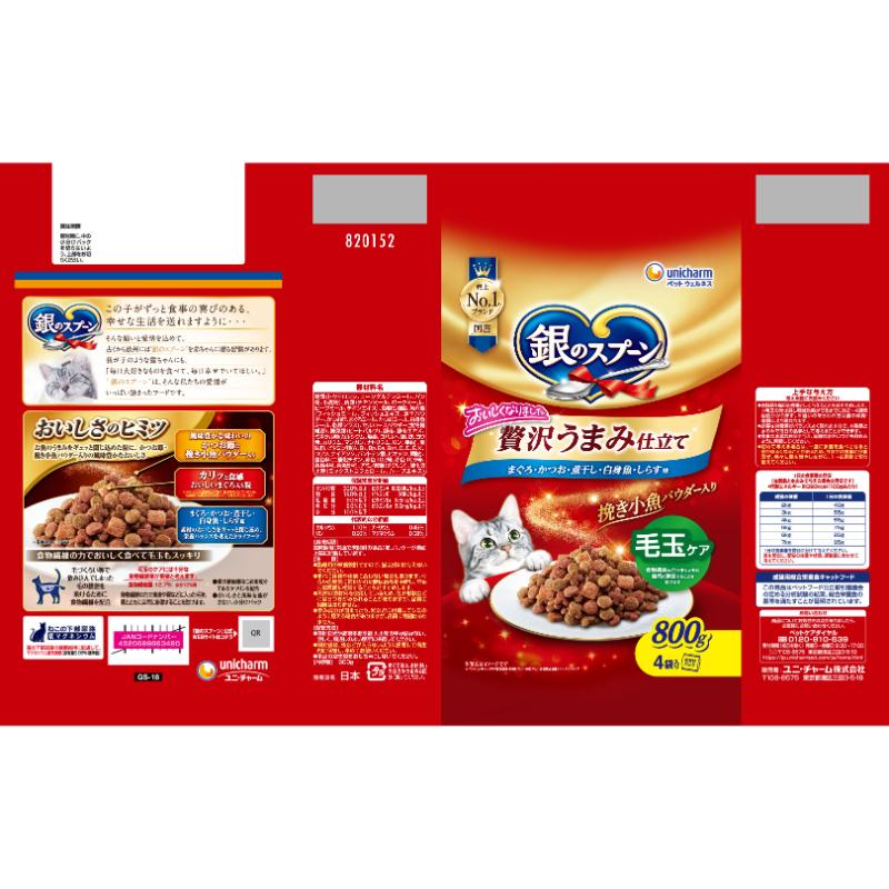 [ユニ・チャーム]銀のスプーン 贅沢うまみ仕立て まぐろ・かつお・煮干し・白身魚・しらす味 毛玉ケア 800g