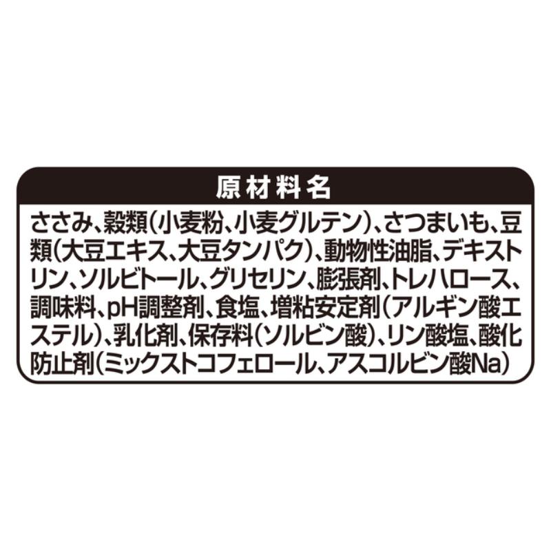 | 素材 | <原材料> ささみ、穀類(小麦粉、小麦グルテン)、さつまいも、豆類(大豆エキス、大豆タンパク)、動物性油脂、デキストリン、ソルビトール、グリセリン、膨張剤、トレハロース、調味料、pH調整剤、食塩、増粘安定剤(アルギン酸エステル)、乳化剤、保存料(ソルビン酸)、リン酸塩、酸化防止剤(ミックストコフェロール、アスコルビン酸Na) <保証成分> タンパク質20.0%以上、脂質3.0%以上、粗繊維2.0%以下、粗灰分8.0%以下、水分35.0%以下 <エネルギー> 約265kcal/100g |