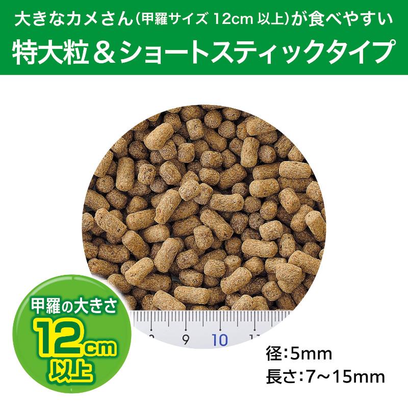 ・甲羅の大きさ12cm以上のカメに適した「特大粒」サイズ。カメの口のサイズに合わせた、食べやすいショートスティック形状。