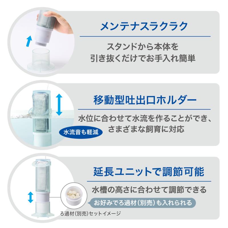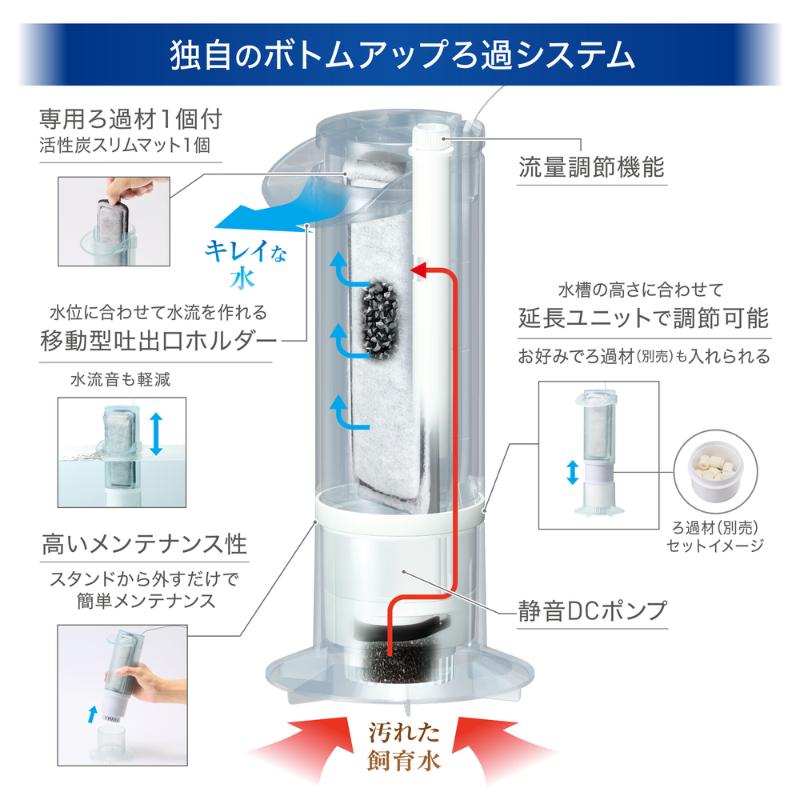 ・底面から水を吸い上げ、ろ過バクテリアが繁殖しやすい独自のボトムアップろ過システムを採用。360°全方向から汚れを吸い取り、水をきれいに保ちます。