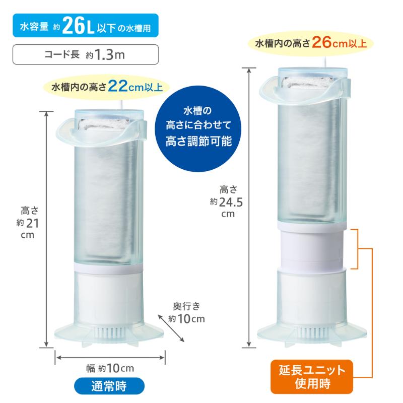 | 注意事項 | ・本製品は屋内観賞魚飼育専用です。他の目的・屋外では使用しないでください。 ・子供に操作・セットさせる場合は、大人の監視のもとで行ってください。 ・セット時・魚の出し入れ・点検・掃除など水中に手を入れるときは、必ず水槽で使用している電気製品を全て差し込みプラグを抜いてください。 ・海水水槽で使用する場合は、塩分や汚れをこまめに拭き取ってください。 ※底砂の種類・粒サイズによっては、水流で底砂が舞う場合があります。 ※底砂に埋めて使用する場合は水中に浮遊した汚れを吸い取りにくくなります。水中に浮遊した汚れを吸い取りたい場合は、底砂に埋めずにご使用ください。 |