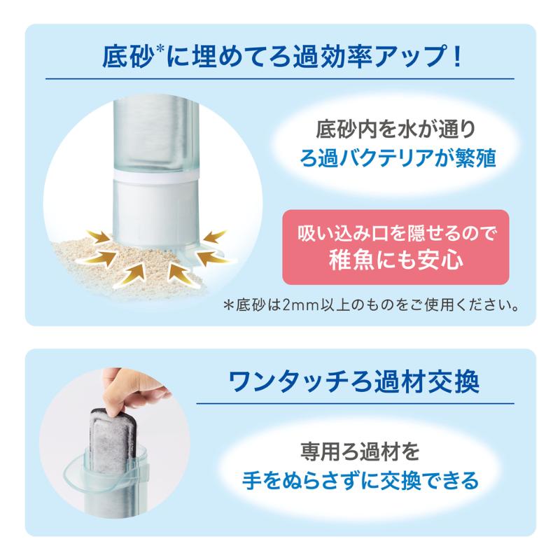 ・スタンドを底砂に埋めて使用することで、底砂内を水が通り、ろ過効率がUP(底砂2mm以上推奨)。稚魚を吸い込みにくい設計。