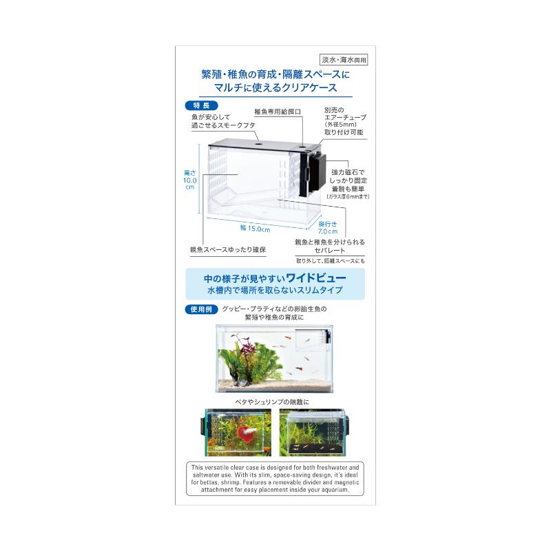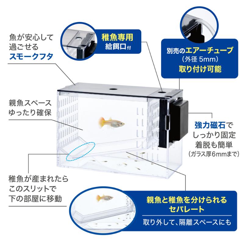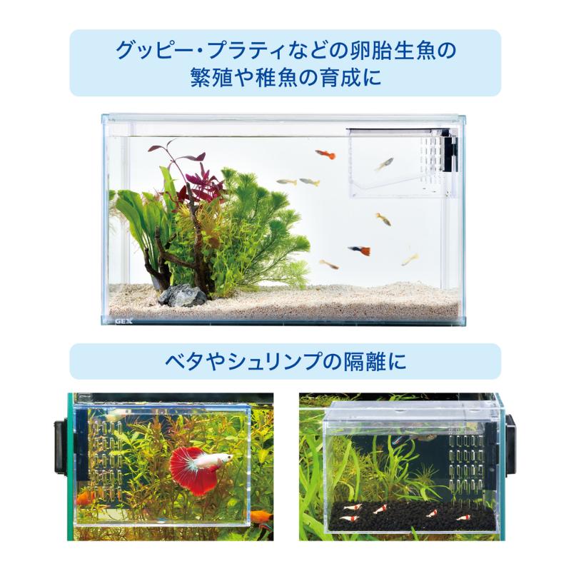 ・熱帯魚や卵胎生魚の繁殖・稚魚の育成・隔離スペースに!親魚と稚魚を分けられるセパレート&稚魚専用給餌口付きなので、元気に育てられる。グッピー・プラティなどの卵胎生魚の繁殖や稚魚の育成、ベタやシュリンプの隔離など、マルチに使用可!淡水・海水両用。