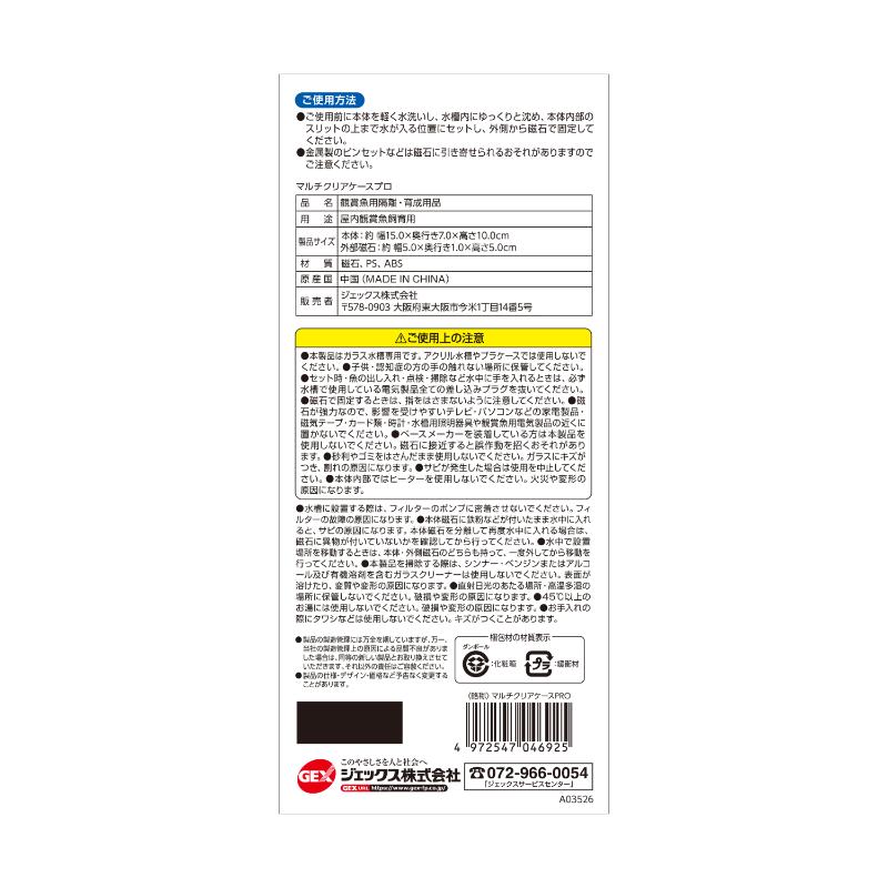 ・子供、認知症の方の手の触れない場所に保管してください。 ・セット時・魚の出し入れ・点検・掃除など水中に手を入れるときは、必ず水槽で使用している電気製品全ての差し込みプラグを抜いてください。 ・磁石で固定する時は、指をはさまないように注意して下さい。 ・磁石が強力なので影響の受けやすいテレビ・パソコンなどの家電製品、磁気テープ・カード類・時計・水槽用照明器具や観賞魚用電気製品の近くに置かないでください。 ・ペースメーカーを装着している方は本製品を使用しないでください。磁石に接近すると誤作動を招くおそれがあります。 ・砂利やゴミをはさんだまましようしないでください。ガラスにキズがつき、割れの原因になります。 ・サビが発生した場合は使用を中止してください。 ・本体内部ではヒーターを使用しないでください。火災や変形の原因になります。 ※水槽に設置する際は、フィルターのポンプに密着させないでください。フィルターの故障の原因になります。 ※本体磁石に鉄粉などが付いたまま水中に入れると、錆びの原因になります。本体磁石を分離して再度水中に入れる場合は、磁石に異物が付いていないかを確認してから行ってください。 ※水中で設置場所を移動するときは、本体・外側磁石のどちらも持って、一度外してから移動を行ってください。 ※本製品を掃除する際は、シンナー・ベンジンまたはアルコール及び有機溶剤を含むガラスクリーナーは使用しないでください。表面が溶けたり、変質や変形の原因になります。 ※直射日光のあたる場所・高温多湿の場所に保管しないでください。破損や変形の原因になります。 ※45℃以上のお湯には使用しないでください。破損や変形の原因になります。 ※お手入れの際にタワシなどは使用しないでください。キズがつくことがあります。 ※製品の仕様・デザイン・価格など予告なく変更することがあります。 |