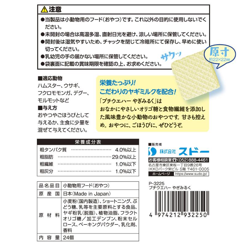 | 注意事項 | ・当製品は小動物用フード(おやつ)です。これ以外の目的に使用しないでください。