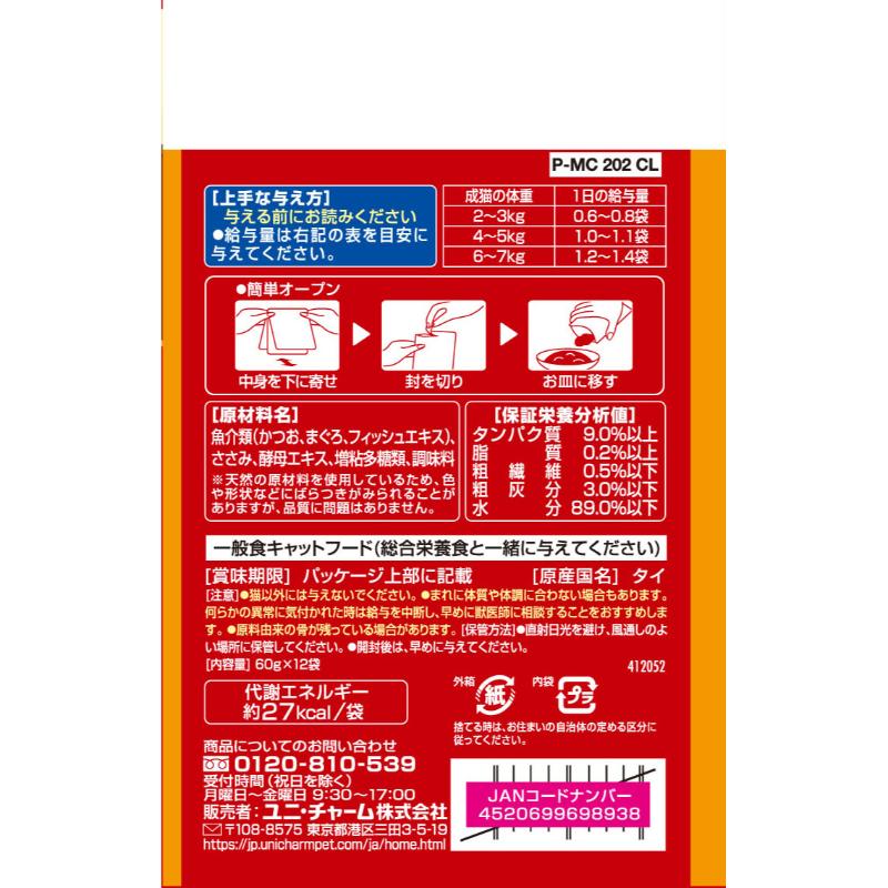 | 素材 | <原材料> 魚介類(かつお、まぐろ、フィッシュエキス)、ささみ、酵母エキス、増粘多糖類、調味料 <保証成分> タンパク質9.0%以上、脂質0.2%以上、粗繊維0.5%以下、粗灰分3.0%以下、水分89.0%以下 <エネルギー> 約27kcal/1袋 |