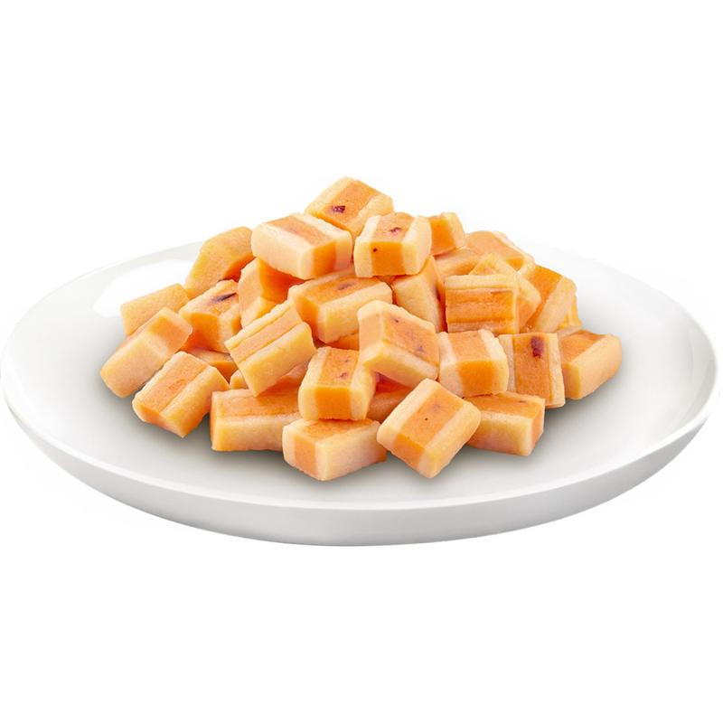 | 素材 | <原材料> 鶏肉(ささみ)、チーズ、でん粉類、かつお節、寒天、卵白粉末、チキンエキス、かつお節エキス、酵母エキス、カゼインナトリウム、増粘多糖類、ビタミンE、パプリカ色素、緑茶エキス <保証成分> たんぱく質19.0%以上、脂質1.7%以上、粗繊維1.0%以下、灰分2.3%以下、水分76.0%以下 <エネルギー> 約12kcal/袋 |