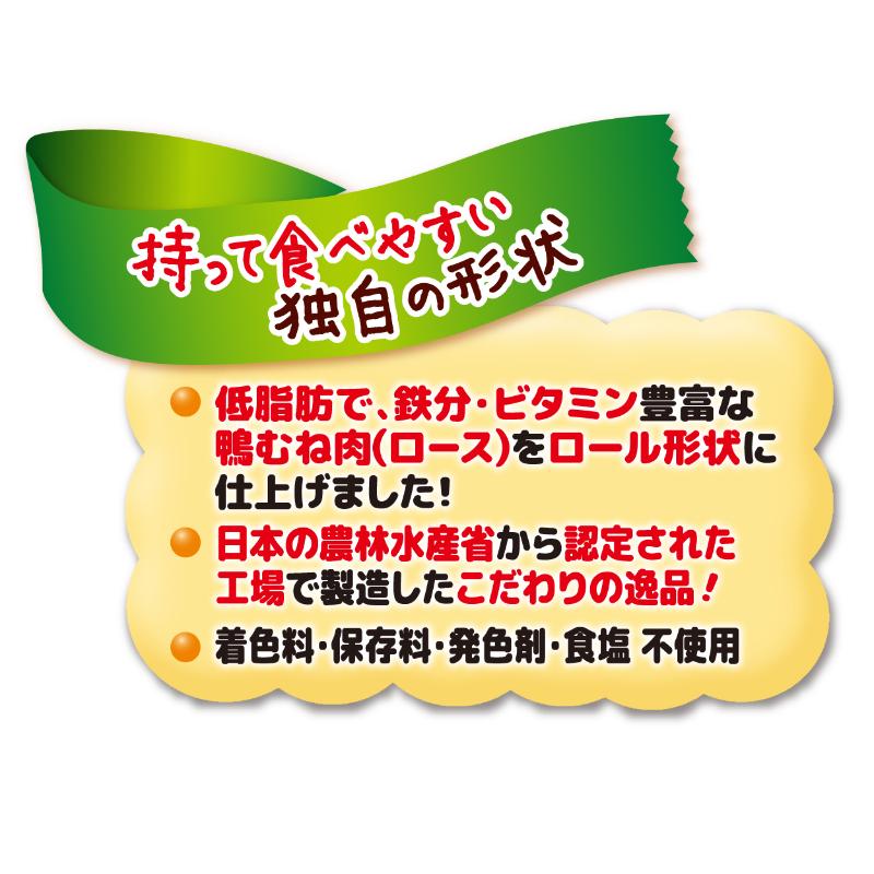 | 素材 | <原材料> 鴨胸肉(ロース)、グリセリン <保証成分> たん白質62.0%以上、脂質5.0%以上、粗繊維0.5%以下、灰分6.0%以下、水分18.0%以下 <エネルギー> 353kcal/100g |
