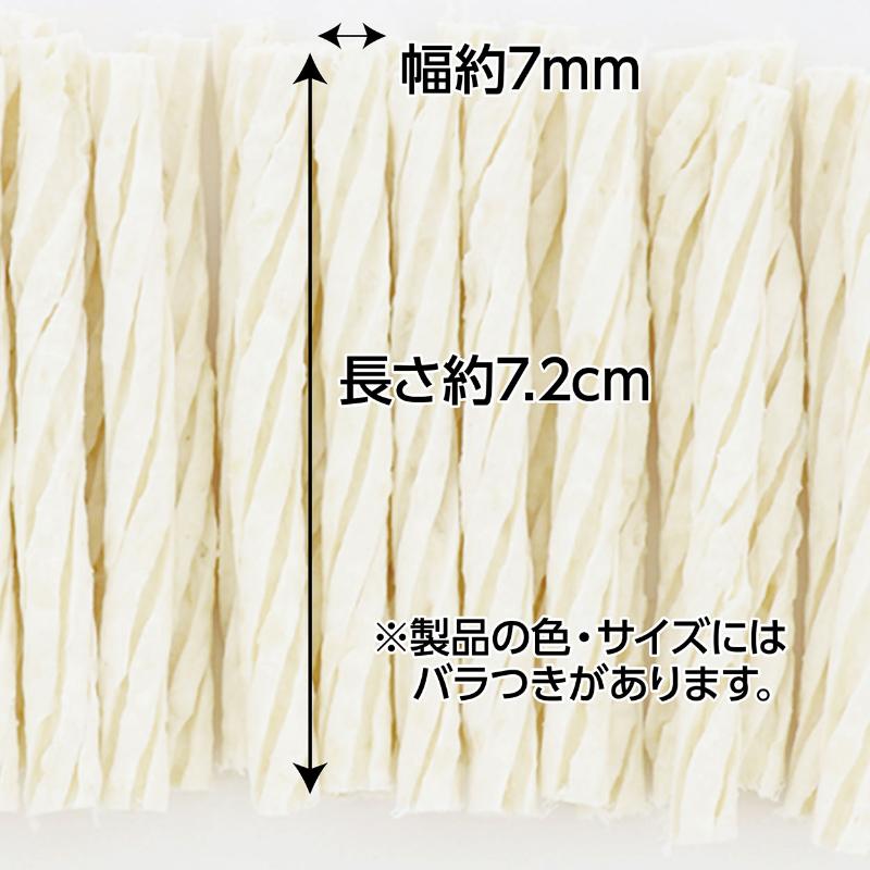 | 素材 | <原材料> 牛皮、馬鈴薯でんぷん、チキンエキス、食塩、殺菌乳酸菌(プラズマ乳酸菌)、卵黄粉末(オボプロン含有)、脱脂粉乳、グリセリン、加工でんぷん、セルロース、増粘安定剤(グァーガム) <保証成分> たん白質2.5%以上、脂質0.1%以上、粗繊維14.0%以下、灰分1.5%以下、水分32.0%以下 <エネルギー> 286kcal/100g |