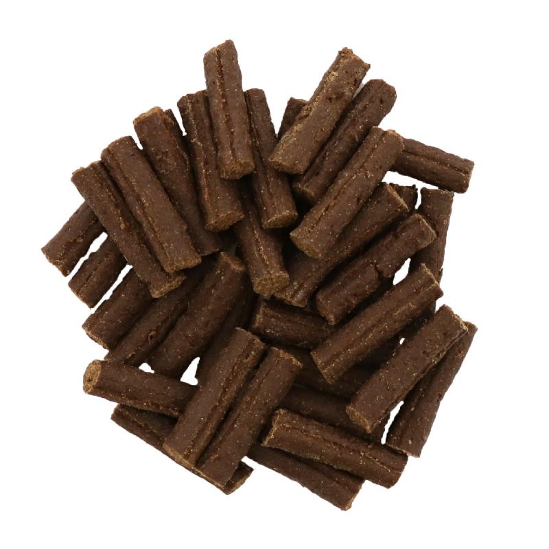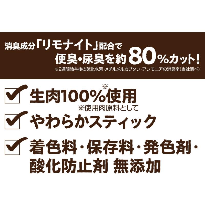 | 素材 | <原材料> 肉類(鶏・鶏ササミ)、小麦粉、脱脂大豆、でんぷん類、リモナイト、小麦たん白、牛脂、グリセリン、プロピレングリコール、リン酸塩(Na)、香料 <保証成分> たん白質15.0%以上、脂質3.5%以上、粗繊維2.0%以下、灰分11.0%以下、水分28.0%以下、ナトリウム0.4g以下 <エネルギー> 283kcal/100g |